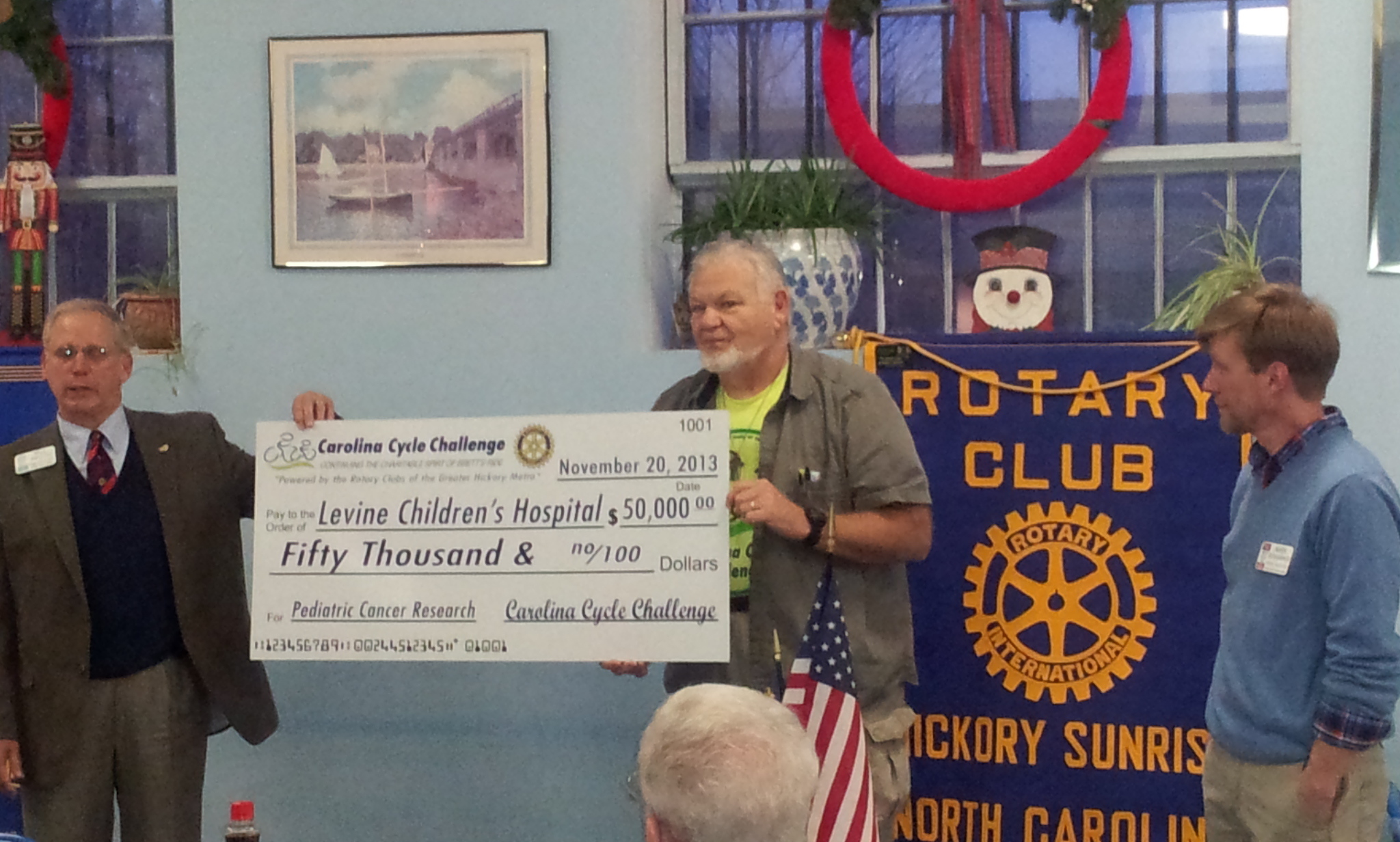 At the club meeting of December 4th, Bill Shillito presented a check for $50,000 raised by the recent Carolina Cycle Challenge. Together with the other Catawba County Rotary Clubs, Hickory Sunrise participated in running this highly successful event, which thanks to matching grants from the Levine foundation among others, raised over $100,000 for pediatric cancer research. We look forward to building on this success at next year’s event. Bill (left) is seen here with the Hickory Sunrise members on the organizing committee, Bob Rinehart and Mark Bumgarner.