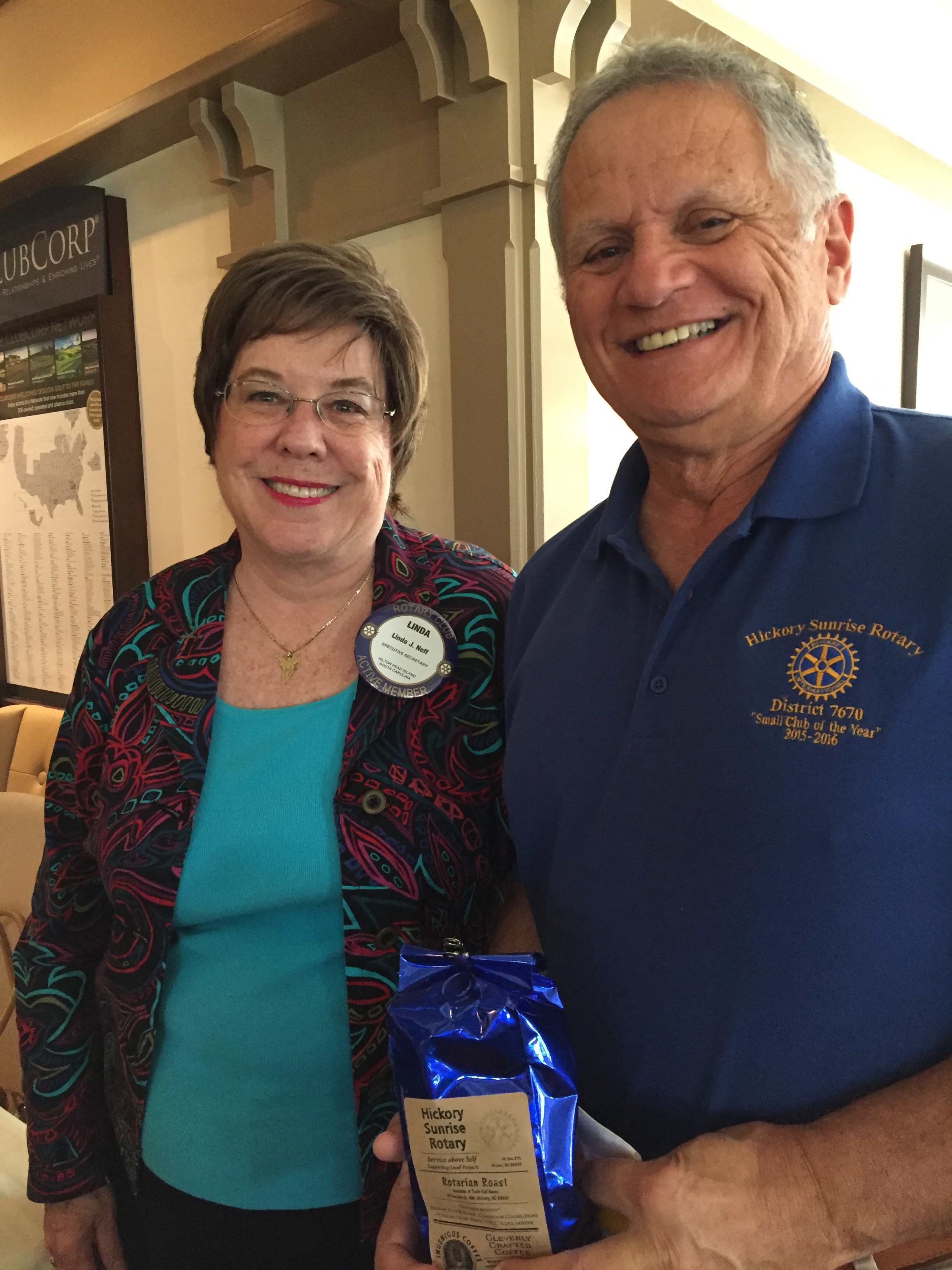 Rotary Club of Hickory Sunrise member Ric Vandett presents a pound of “Hickory Sunrise Rotary Roast” to Linda Neff of the Rotary Club of Hilton Head Island at that club’s first meeting since Hurricane Matthew hit the Island in early October. The coffee is a special blend created by Hickory Sunrise member Scott Owen who owns a coffee shop in Hickory.