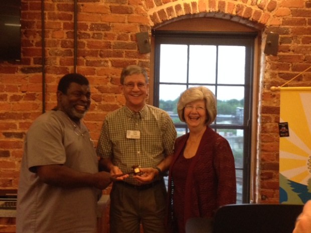 June 22nd saw the end of our Rotary year and the passing of the gavel from President Michael (on left with the inappropriately large grin) to incoming President Phil. A big thanks to Michael for his leadership over a very successful past year, which saw the club recognized as the District’s best small club and, more importantly, raise and distribute record amounts for scholarships to Catawba Valley Community College, represented at the meeting by Teresa Biggs (right), Executive Director, CVCC Foundation.